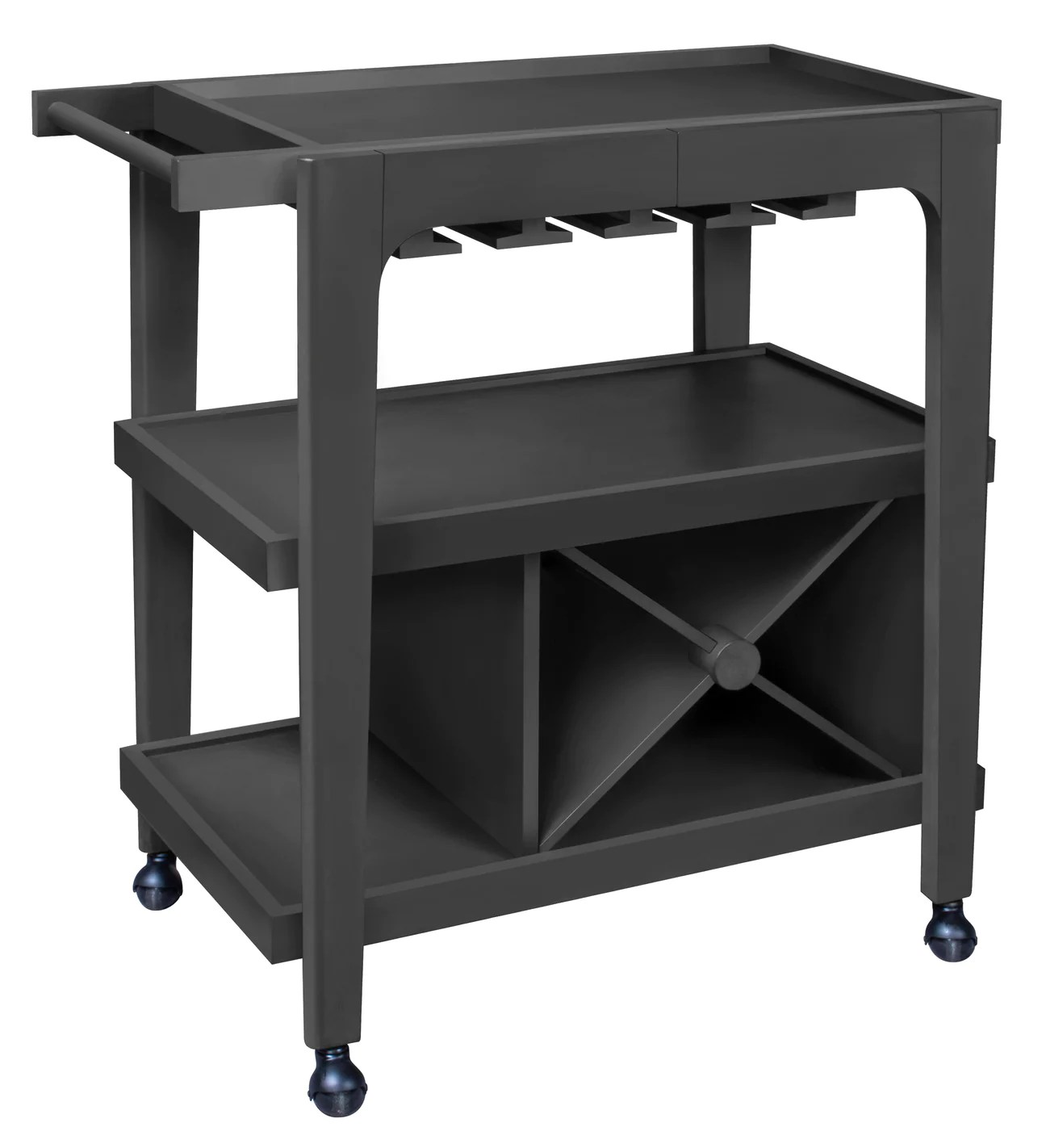 There’s room for bottles of liquor and wine, hanging stemware and enough space on top to mix up any cocktail. Included are 2 bar mats to protect the top surface against spills and condensation. Heavy duty casters allow the cart to roll on just about any surface. Packed with an amazing amount of storage you can have everything you need to keep the party “rolling”. Available in multiple finishes.